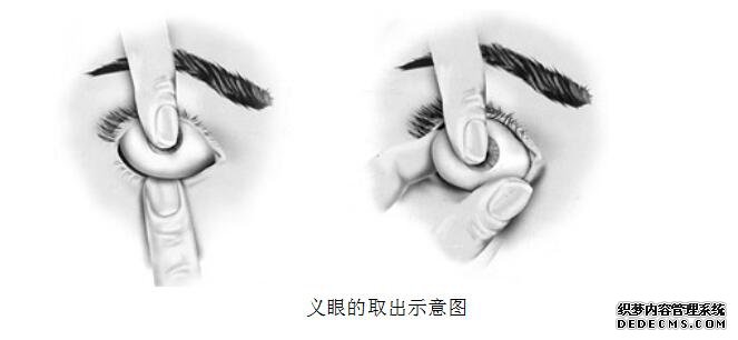 取出義眼與安裝義眼類似。安裝義眼時是將上眼皮提高自下而上滑入